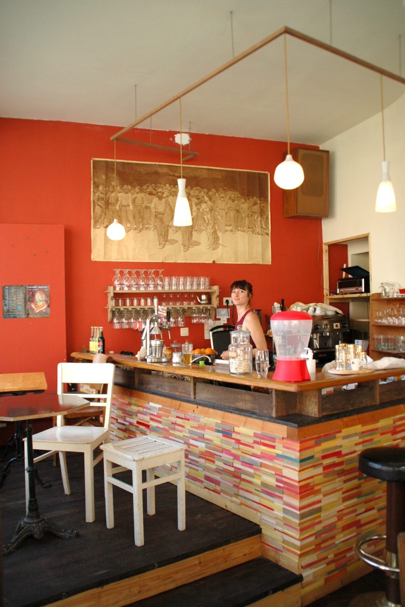 Pendant les permanences du soir (en semaine de 17h à 20h, et jusqu’à 23h les vendredis et samedis), c’est souvent apéro sur la terrasse, avec de temps en temps des petits concerts. Là, on est souvent deux à tenir le bar, parce que parfois il peut y avoir du monde et que c’est chouette d’être aidé.